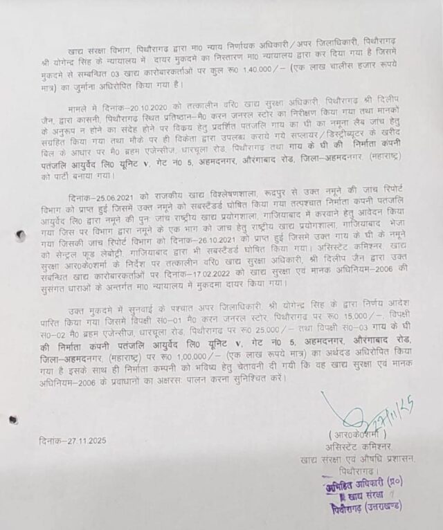 उत्तराखंड के पिथौरागढ़ में बाबा रामदेव की कंपनी पतंजलि के घी के सैंपल जांच में फेल पाए गए हैं। जिसके बाद कंपनी समेत 3 कारोबारियों पर 1 लाख 40 हजार रुपए का जुर्माना लगाया गया है। साथ ही खाद्य विभाग का कहना है कि ये खाने लायक भी नहीं है।