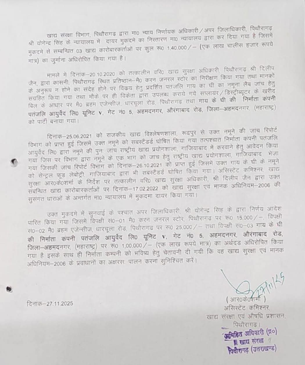 उत्तराखंड-पिथौरागढ़ में बाबा रामदेव की कंपनी पतंजलि के घी के सैंपल जांच में फेल पाए गए हैं. कंपनी समेत तीन कारोबारियों पर 1 लाख 40 हजार रुपए का जुर्माना लगाया गया है. खाद्य संरक्षा एवं औषधि प्रशासन पिथौरागढ़ के असिस्टेंट कमिश्नर आरके शर्मा की मानें तो घी के सैंपल की जांच प्रदेश स्तर (रुद्रपुर) और राष्ट्रीय स्तर (गाजियाबाद) की लैब में कराई गई थी। जांच में घी स्टैंडर्ड पर खरा नहीं उतरा। अगर किसी ने भी यह घी खाया तो उसके साइड इफेक्ट हो सकते हैं। साथ ही लोग बीमार हो सकते हैं।